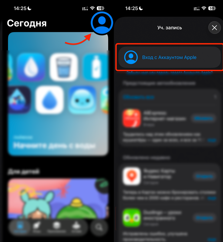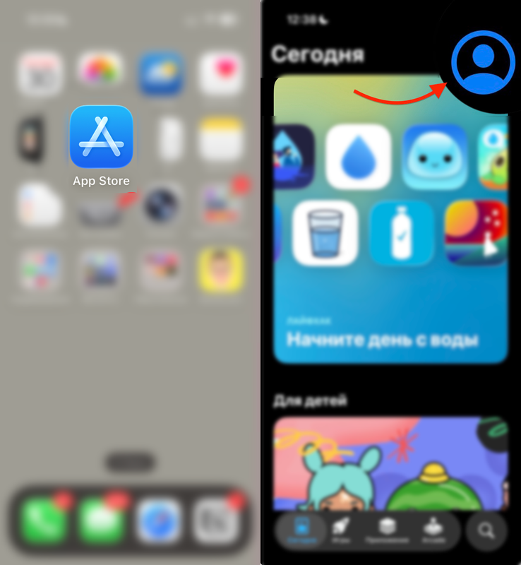 Для этого снова открываем App Store и нажимаем на значок в правом верхнем углу.