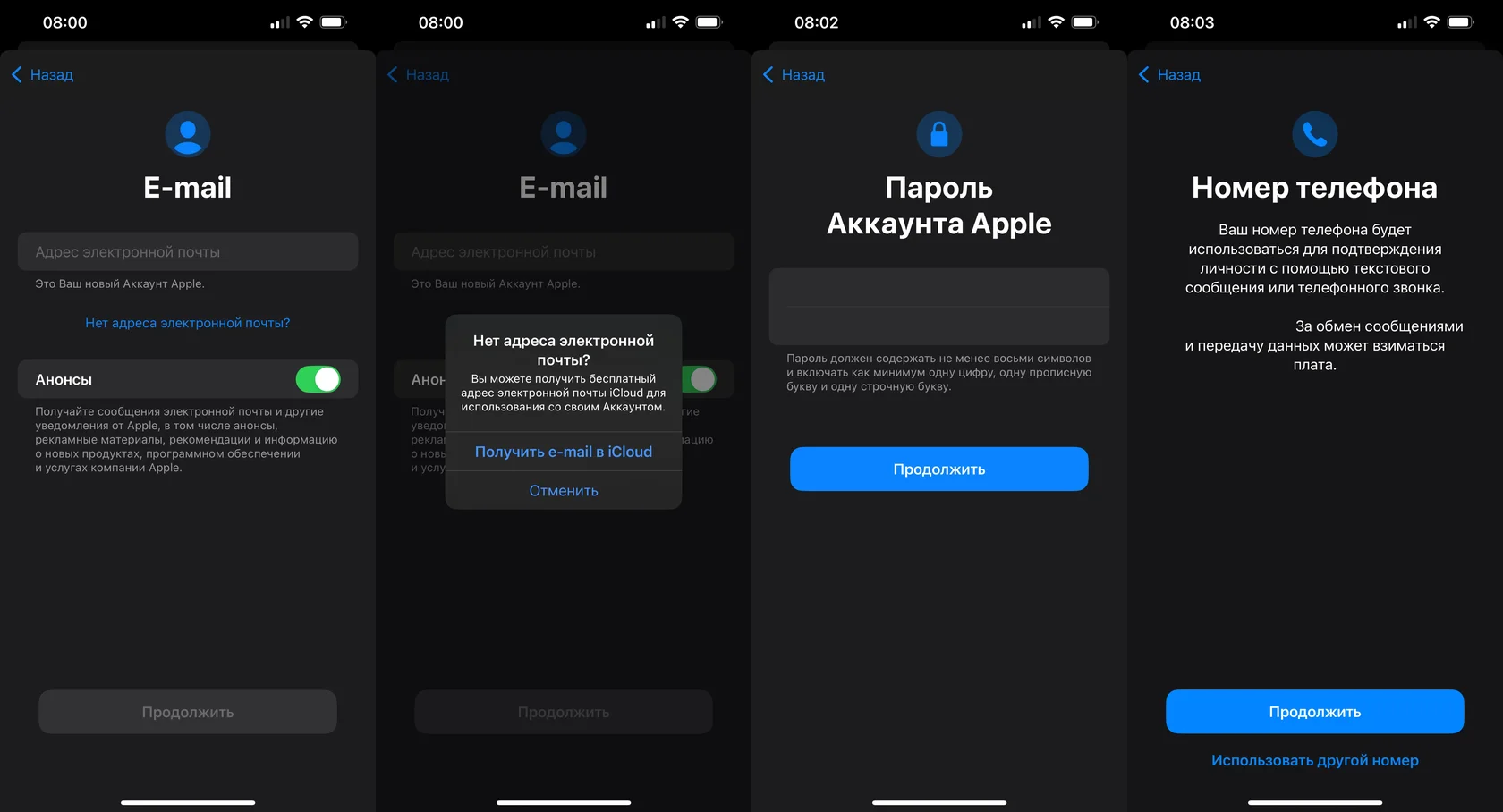 Дальше у всех всё одинаково. Почту можно указать свою, например Gmail или Outlook. Либо нажимаем Нет адреса электронной почты и создаем почту iCloud.