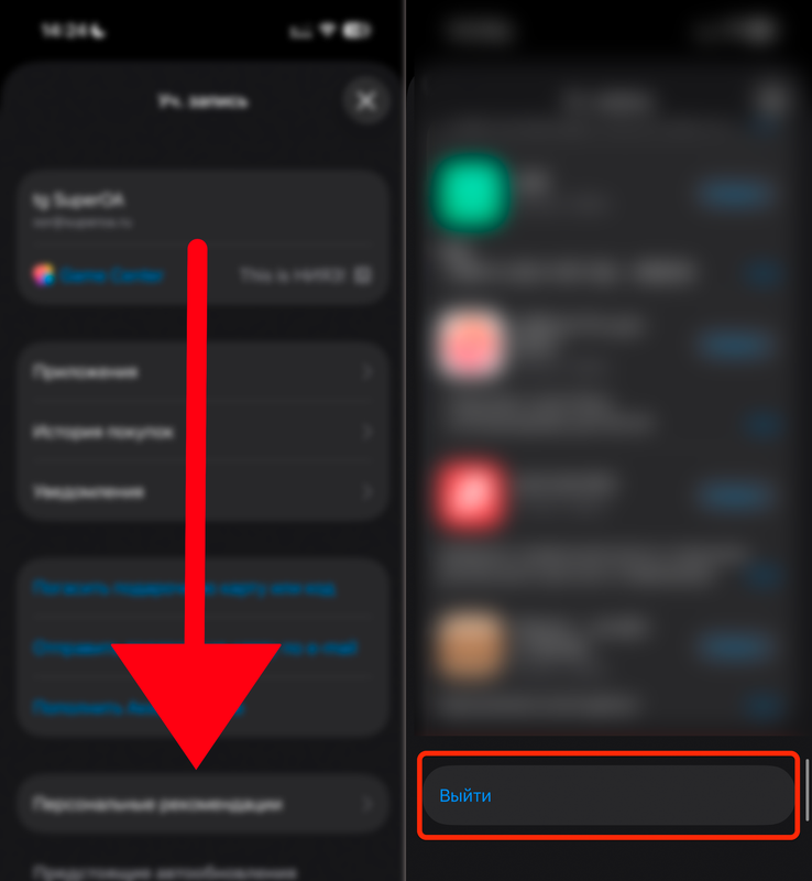 Открываем App Store, переходим в профиль в правом верхнем углу и выходим из текущей учётной записи. Для этого пролистайте в самый низ и нажмите на кнопку «Выйти». Таким образом, мы выйдем из аккаунта только внутри App Store (не переживайте, вы всегда сможете вернуться на свой основной).