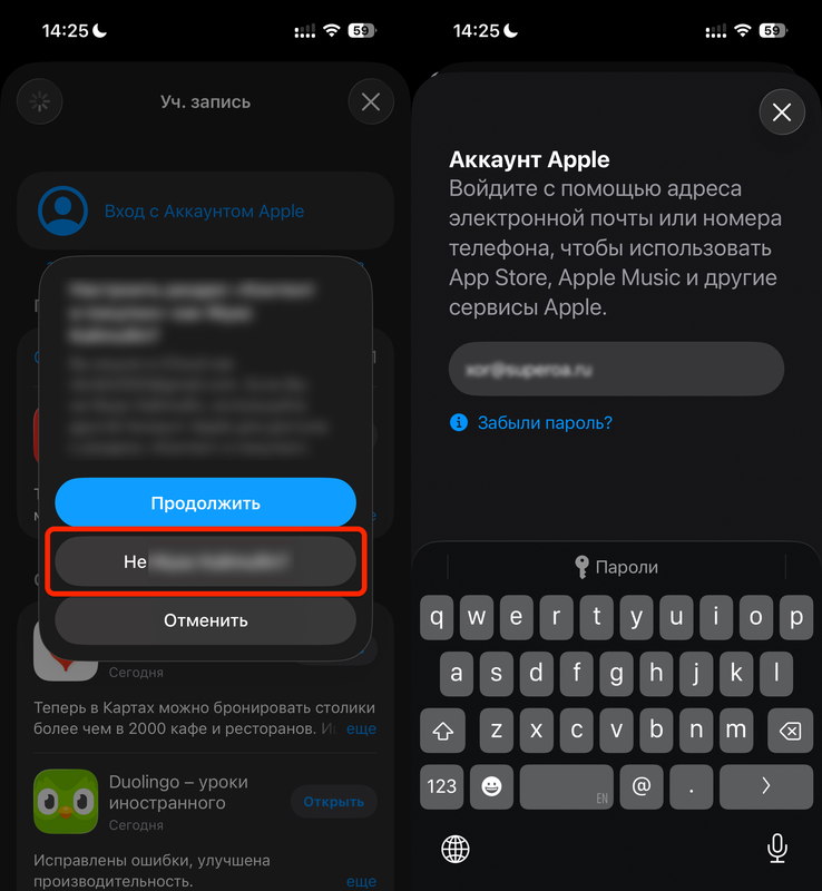 Там будет выбор «Продолжить» (как раз-таки зайти со своего Apple ID, который указан в настройках), но нам нужен второй вариант — «Не [ваше имя]?». Осталось войти в тот аккаунт, который вы зарегистрировали. Тут всё просто: введите Apple ID (почту), пароль и жмите «Продолжить».